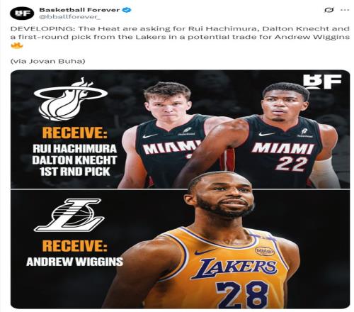 根据湖人记者约什-布哈的消息,热火对威金斯的要价是湖人一个未来不保护的首轮签、道尔顿-克内克特、八村垒,也就是要1换3,他们也真的要的出口。