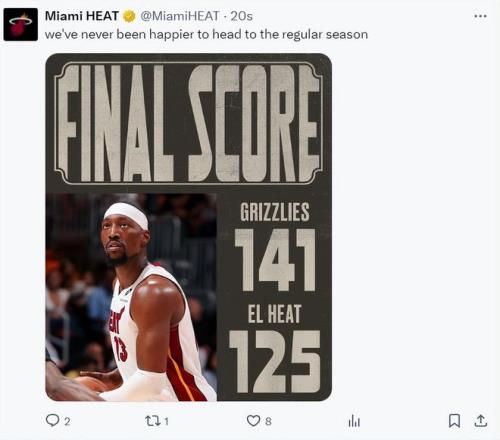 北京时间10月18日,NBA季前赛,热火125-141惨败灰熊。这场比赛热火是被逆转的,前三节打完热火都领先灰熊,但末节两队第三阵容的比拼灰熊一波39-22打崩热火,最终灰熊在客场拿到胜利。